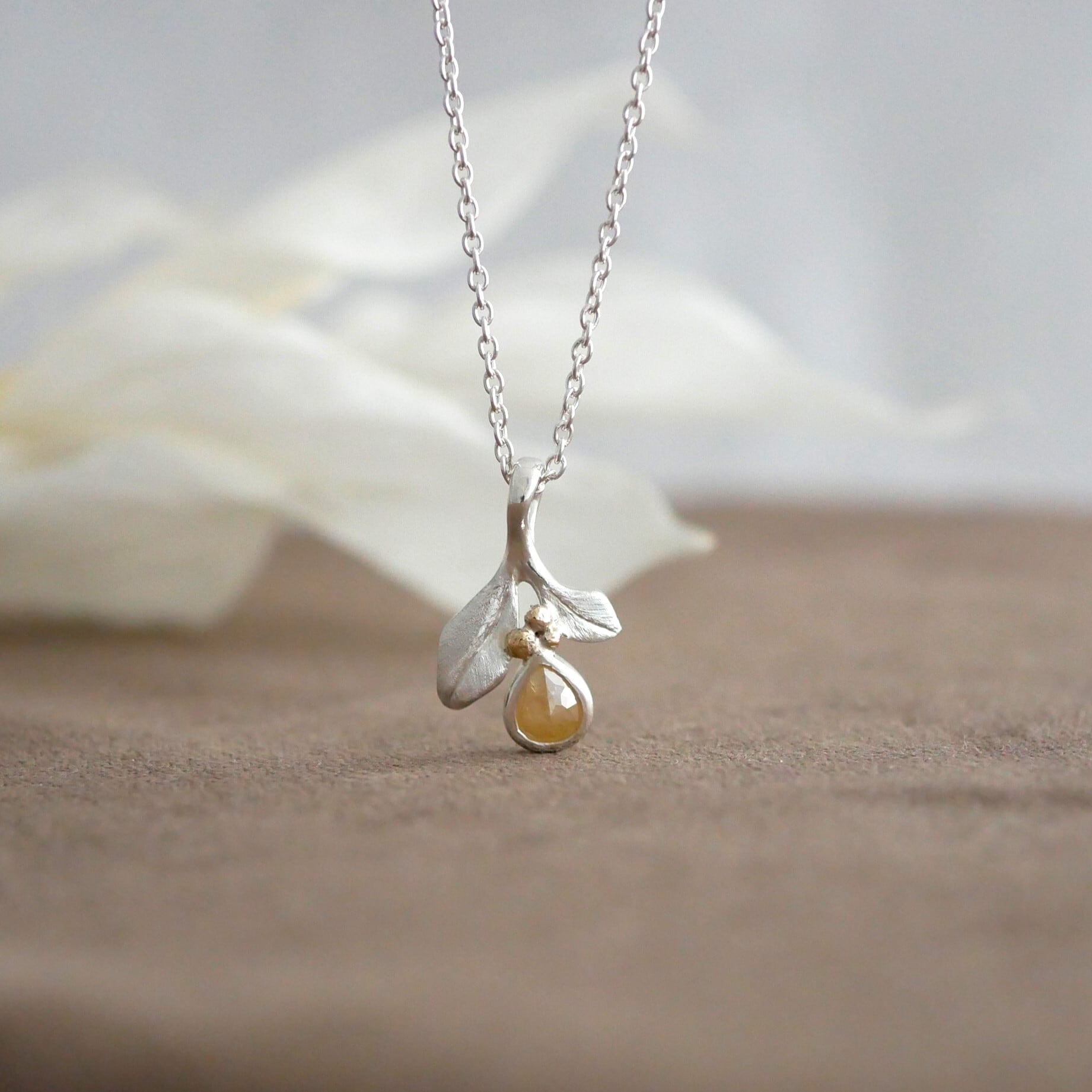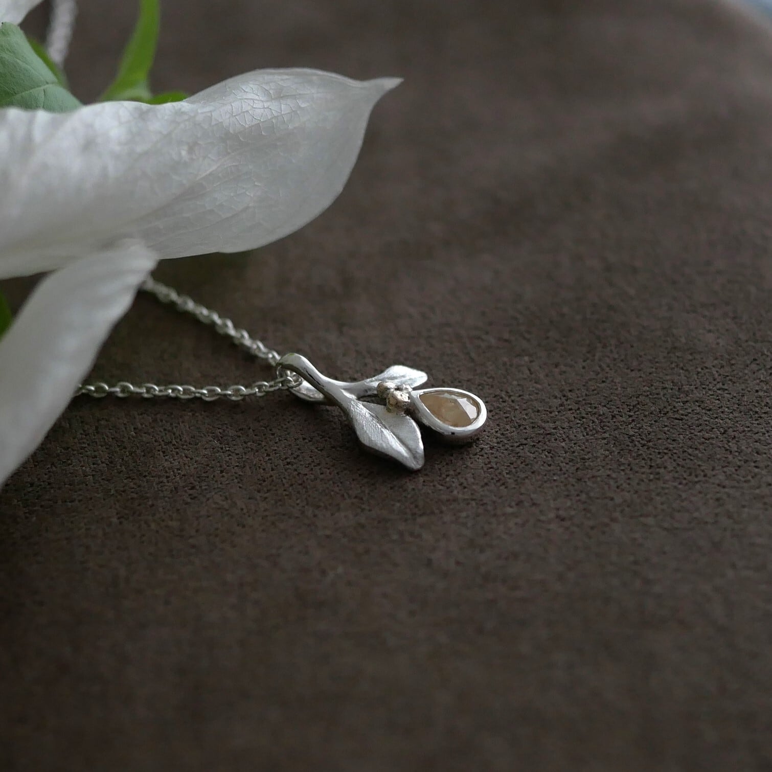 真白な純銀の葉に小さな金の粒を添えたボタニカルモチーフのペンダントにしました